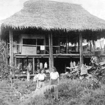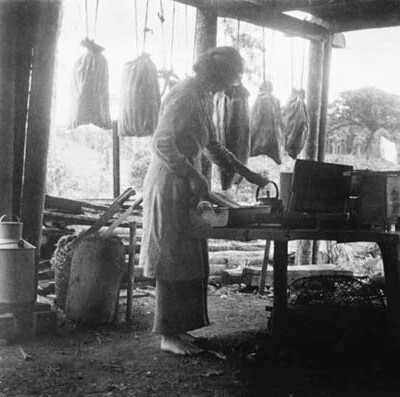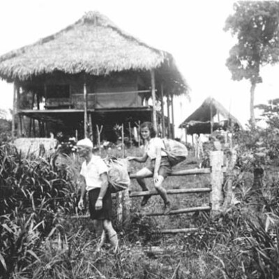 A group of us walked from Tingo to Quito, only to be caught in a heavy rainstorm. The kindly people in the choza (simple cottage) kindly offered us shelter. From left to right (right half): ?, ?, (rear) Witja Tuerkel, Gerda Pesach. Front, Edith Wellisch