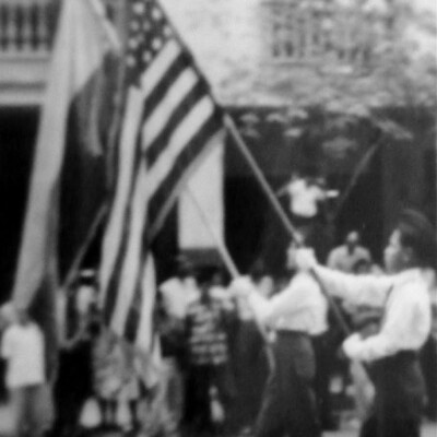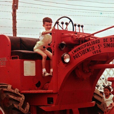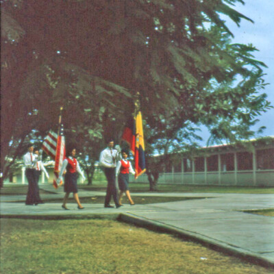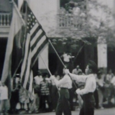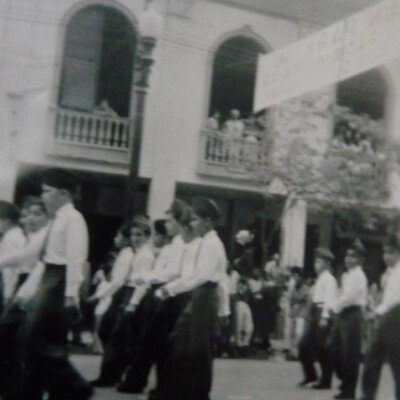 Taken on the Desfile del 9 de Octubre, on the same avenida (9 de Octubre). This time it is me in the Colegio Internacional holding one of the ribbons of the Estandarte. On the other side you can see Johanna List. This photo was probably taken in 1947 or 1948. Mr. List is walking behind us during the desfile.