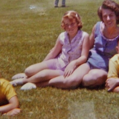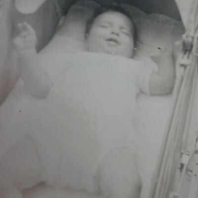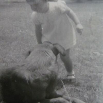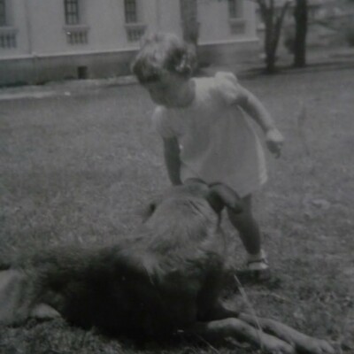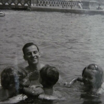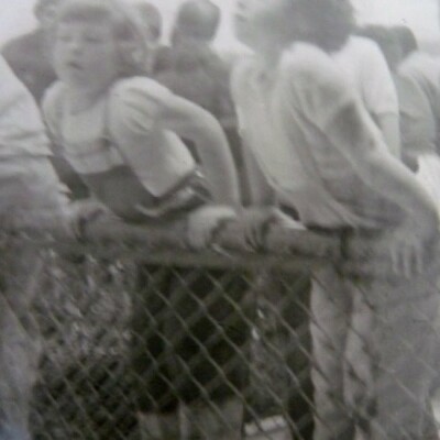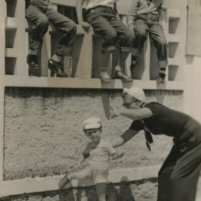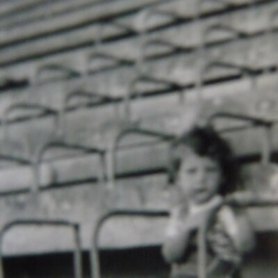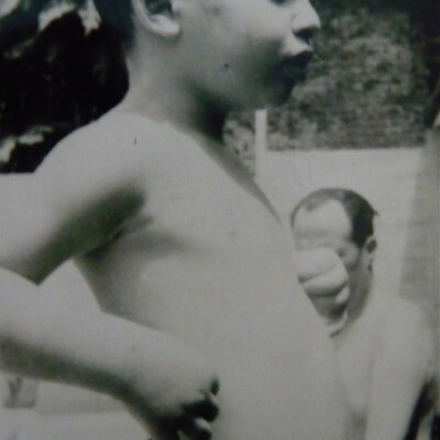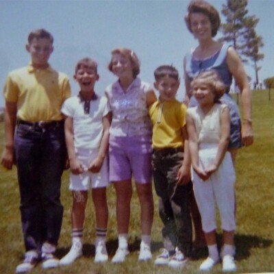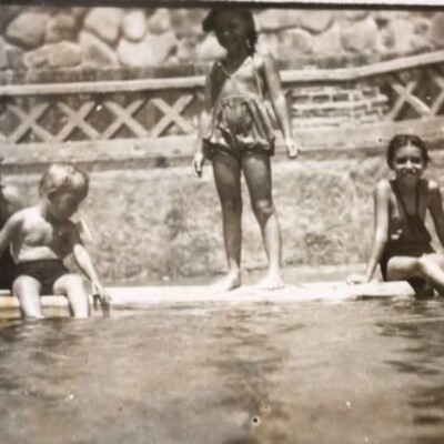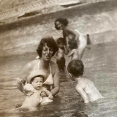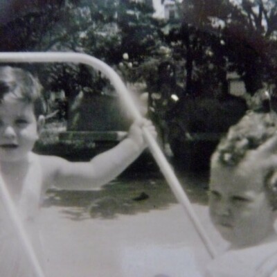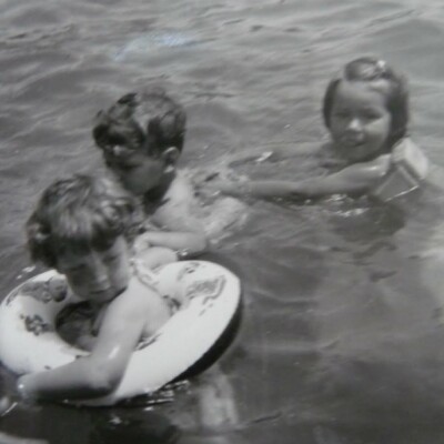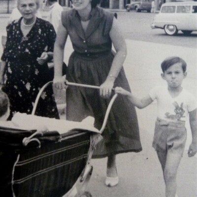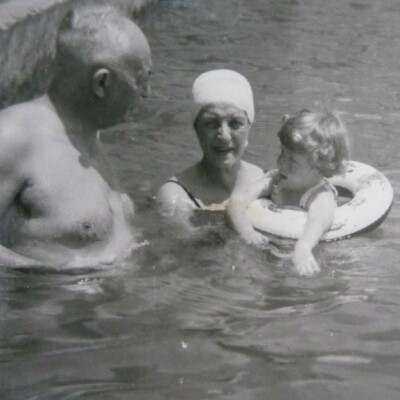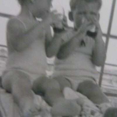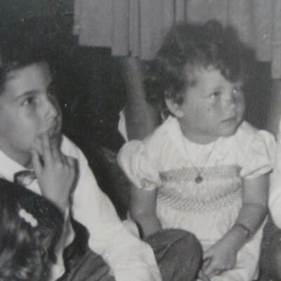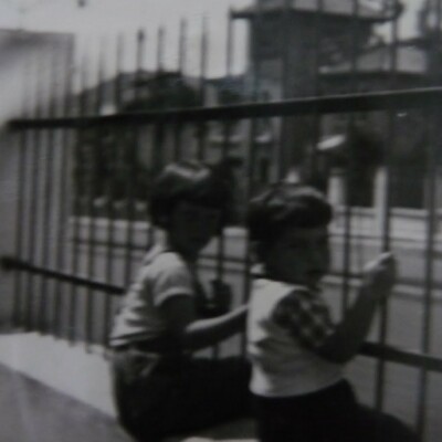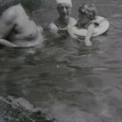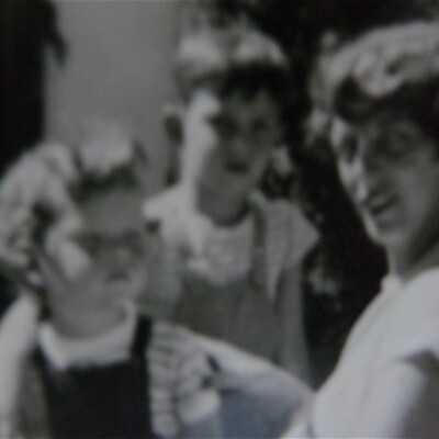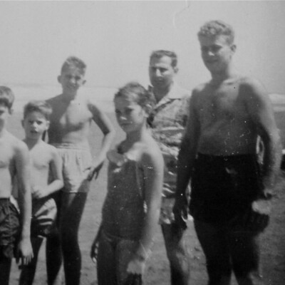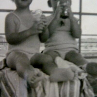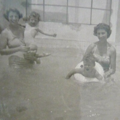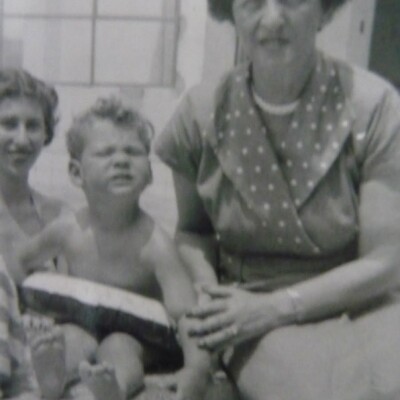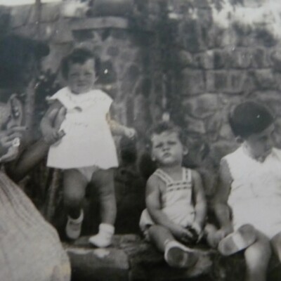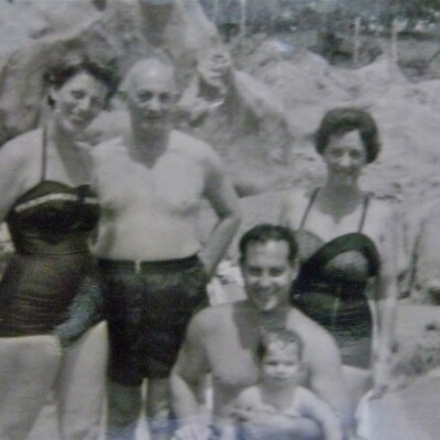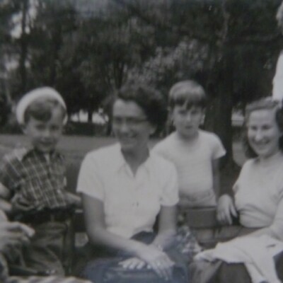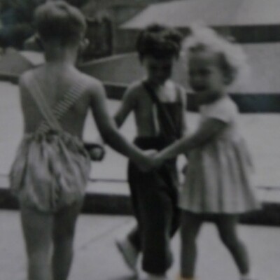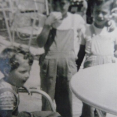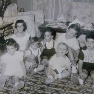 From left (sitting on bench in back) Gerda Sifnaghel (nee Gumpel); Katja Sifnaghel; Peter Albers (in front of Katja); ???; Fred Grunewald; Lynn Gumpel (in carriage); Susie Albers; Niko Sifnaghel