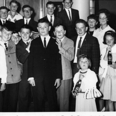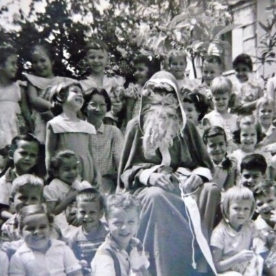 Attached are a few photos from "Mrs. Lenky's Kindergarten." If I'm not too much mistaken, the kindergarten teacher's real name was Lempke. However, we kids couldn't pronounce this name, so she was Mrs. "Lenky." This is a photo of Mrs. Lenky's children production, Christmas 1956. I'm standing with black gloves and a candle in my hand staring on Santa Claus.