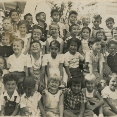 School award ceremony at Escuela Americana -- ca. 1957, Guayaquil. Top Row(left to right): ?, Alan, Peter Albers, Fred Grunewald, Alfredo Hincapie, ??. ?? Bottom (left to right): Jeanny Schneidewind, ??, Nicky Landers, ??, Christina ?