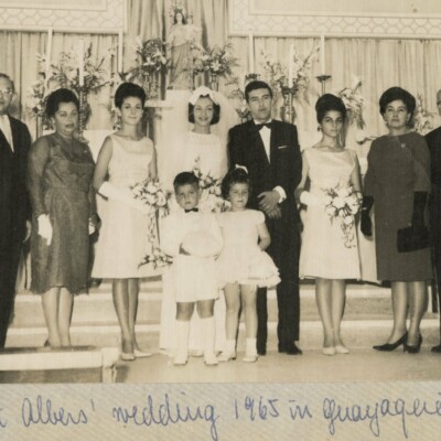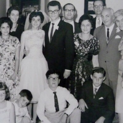 Wedding of Andy Lakatos and Katja Sifnaghel: from left: Elisabeth (Lieschen) Gumpel (nee Partos); Gerda Sifnaghel (nee Gumpel), partly hidden; Manea Sifnaghel; wife of Hans-Heinz Braasch; Ilse Grunewald (nee Koppel); Katja Sifnaghel; Andy Lakatos; Heinz Grunewald; Magda Koppel (nee Partos); Hans-Heinz Braasch; John Koppel; Lilla Lakatos; and Gustav Gumpel. Front row: Peggy Grunewald; Ralph Grunewald; Niko Sifnaghel; and Fred Grunewald -- 1961, Guayaquil