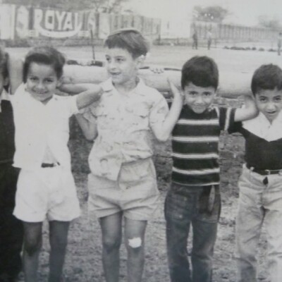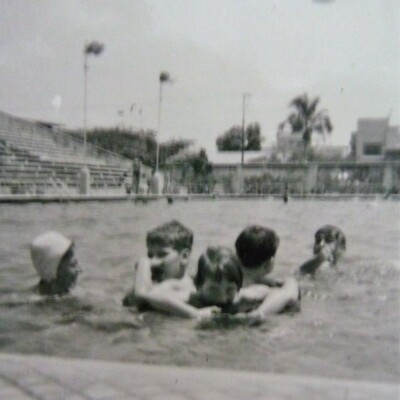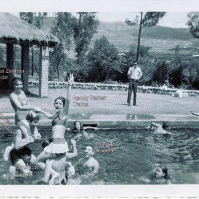 Club Israelita de Guayaquil, ca. 1964. De izquierda a derecha: Fito Gumpel, Miguel Feldman, Niko Sifnaghel, Peter Albers, un companero de Peter, Roberto Fischler, Roberto Goldbaum, Saul Suster, y Nikki Landes (atras). El pequeño parado delante de Pedro Albers es Danny Czarninski.