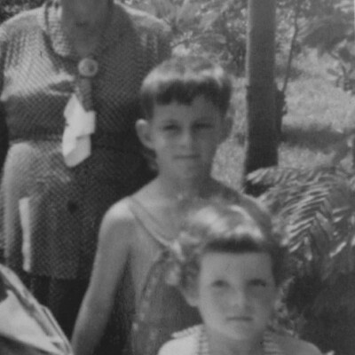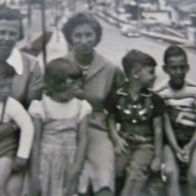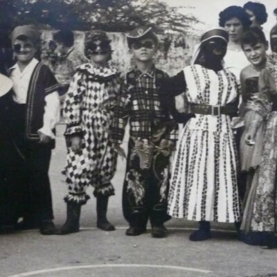 The big group might have been celebrating Purim. I'm one of the clowns and Elizbeth Klein (nee Nussbaum "Chichi") is the other one. On the far right you can see Lotte Rosenberg holding Franklin's hand, and visibly being pregnant with her second child. I can identify a few people in the photo: From left: Roni Coifman, the Grunauers, the Menasse girl and boy (on the second row), Abraham Suster, Manya Swechensky (on the far right), Ruthie Stein, further to the right is Hannelore Caminer, Dorita Hazins, Dani Coifman. This picture might have been taken in 1950 or 1951 -- Guayaquil