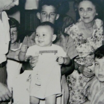 Christian Braasch's first birthday party. Back row, far left: Else Wellisch (nee Deller); far right: Hans-Heinz Braasch. Middle row, left to right: ??, "La Senora" (Hans-Heinz Braasch's wife), Magda (Moschi) Koppel (nee Partos), Gerda Signaghel (nee Gumpel), Elisabeth (Lieschen) Gumpel (nee Partos), Ilse Grunewald (nee Koppel). Front row, left to right: Ralph Grunewald, Christian Braasch, Peggy Grunewald, Fred Grunewald, Niko Sifnaghel -- September 20, 1961, Guayaquil